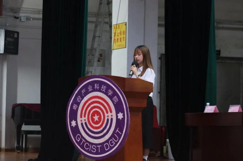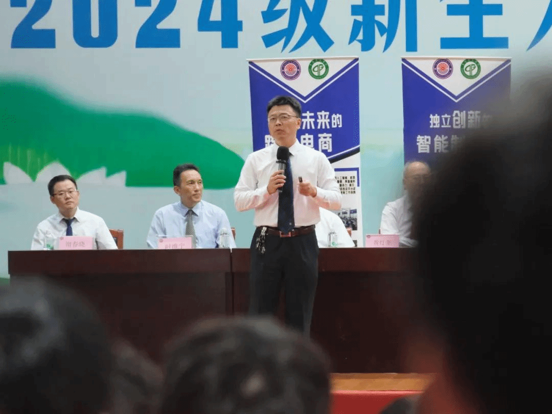 仪式第六项,新生代表2024级经济与金融1班的邓子菲同学发言,她代表全体新生向师长和亲友表示真挚的感谢,并表示将在四年老员工活中,学而知不足,学以致用,开拓创新,抓紧机遇,迎接挑战。