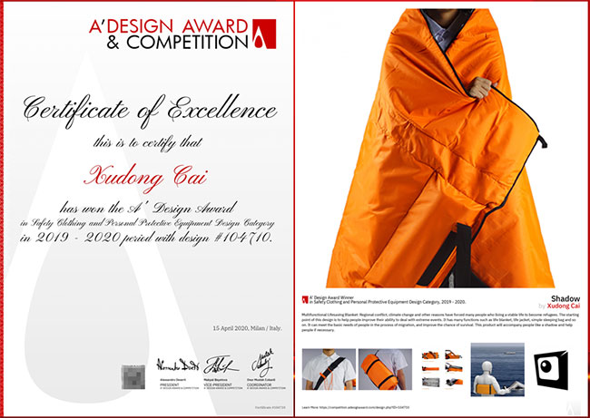 作品“Shadow”是一件多功能应急救援产品。它能够通过简单的扩展与变换形态后,拥有浮力助具、救生毯、简易睡袋等多种功能,可应用于紧急救援,户外探险等场景。此设计的出发点是希望能够提高普通民众遇到紧急事件的应对能力,也体现伟德betvlctor1949源于英国员工的社会同理心与社会职责。伟德betvlctor1949源于英国坚持以赛促学,成果导向,跨学科人才培养,让员工在专业学习和实践中锻炼成长。此次获奖是伟德betvlctor1949源于英国自2018年以来第二次获得该奖项,是伟德betvlctor1949源于英国创新人才培养模式,建立新工科的人才培养路径,实现高质量人才培养的重要体现。目前,蔡旭东同学已被广东工业大学录取为硕士研究生。 A’design Award设计大奖赛与德国红点、iF设计大赛并称为国际三大设计大赛,是目前世界上最大型最综合的全球性设计比赛,被誉为欧洲设计界的奥斯卡,是全球领先的国际年度设计比赛,是一项被国际平面设计协会联合会ICOGRADA、欧洲设计协会BEDA所认可的国际赛事。同时,它也是ICSID(国际工业设计协会), ICOGRADA(国际平面设计协会)& ADI(意大利工业设计协会)的成员组织。