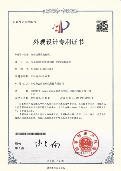 近日,伟德betvlctor1949源于英国与东莞市吉洋自动化科技有限公司共同设计研制成功的吉洋光学检测设备产品,成功申请了三项外观设计专利:全自动外观检查机、全自动光学检测设备(顶部镜头在线式)、全自动光学检测设备(底部镜头在线式)。