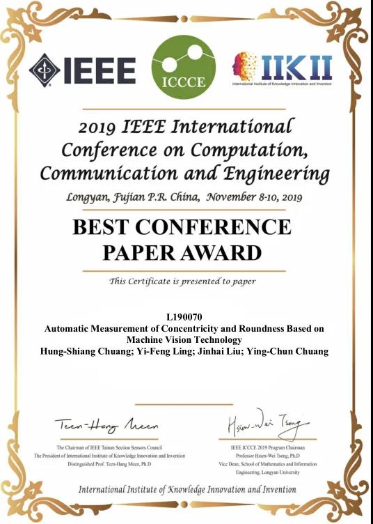 11月8-10日,通信、计算与工程国际研讨会(IEEE ICCCE 2019)在中国福建召开,伟德betvlctor1949源于英国庄宏祥教授指导2016级机械专业员工凌奕锋撰写的论文“Automatic Measurement of Concentricity and Roundness Based on Machine Vision Technology”获最佳论文奖。