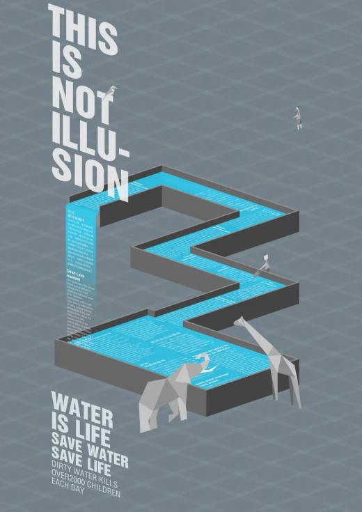 《This is not illusion》由潘昌雨老师指导完成。获奖同学表示他受到M.C.Escher作品的启发,海报以一个因视错觉而形成循环的水道为主体,表达了水资源污染者最终将会自食其果并危害其他生命。海报名为“This is not illusion”,意为“这不是幻觉”,即海报上的图像虽然是一种视错觉,但其表达的含义却真真切切地发生在我们周围。