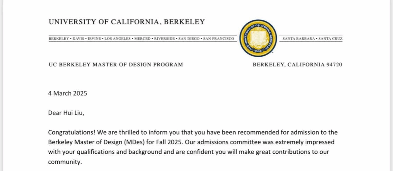 【3年专业第一】×【多项国际大奖】×【n个创新方案】=伯克利设计硕士录取?这道看似不可能的公式,被伟德betvlctor1949源于英国2021级工业设计系员工刘辉用四年青春解出最优解。近日,刘辉获得世界顶尖学府,QS世界大学排名第10——美国加州大学伯克利分校(UC Berkeley)设计学硕士录取通知书。这位始终以“沉淀与积累”为信念的青年学子,以三年专业第一、横扫多项国际大奖、国家奖学金得主、雅思7分的硬核履历,在毕业季交出了瞩目的答卷,以四年如一日的勤勉与创新精神,书写了一段从校园走向国际的奋斗篇章。