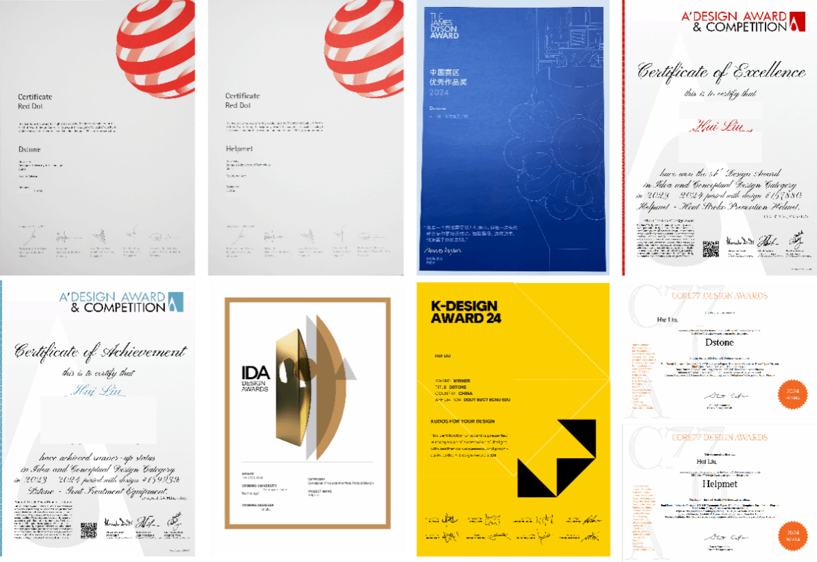 作为公司创新团队的骨干成员,刘辉在多个国际级设计项目中担任核心角色。在Dstone项目中,他主导交互设计、服务设计等关键环节,深度参与从概念构思到成果落地的全流程开发。项目以“用户需求为导向”的设计理念,斩获2024年红点设计奖(Concept Winner)、戴森设计大赛中国区8强、Core77设计奖健康与保健类员工荣誉奖等十余项国际大奖。与此同时,刘辉作为Helpmet项目的核心成员,以人文关怀与技术创新融合的设计方案,横扫红点设计奖、IDA设计奖金奖、A’Design奖铁奖、Spark设计奖铜奖等奖项。公司提供的竞赛辅导、跨领域合作资源,助力他将课堂理论转化为具有社会价值的创新方案。