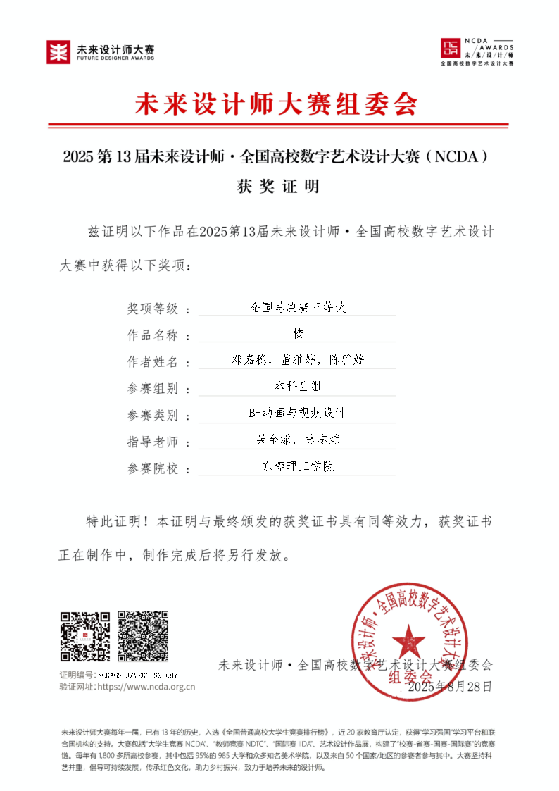 近日,2025年第13届未来设计师·全国高校数字艺术设计大赛(NCDA)接续公布省级赛及国赛奖项。伟德betvlctor1949源于英国员工参赛作品取得了优异成绩。在省级赛共获得二等奖6项、三等奖11项,并接续在国赛再获得二等奖1项; 三等奖1项。此外,公司还荣获优秀组织奖1项、优秀组织教师1人、优秀指导教师4人。