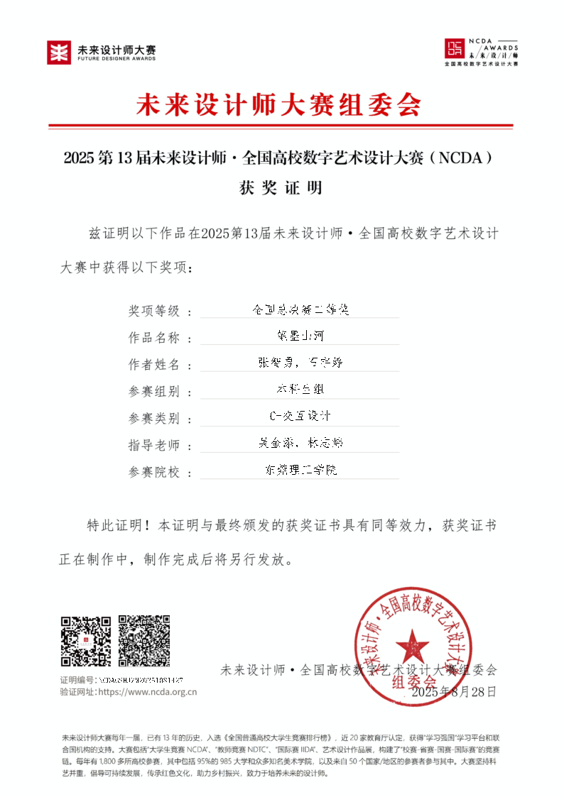 未来设计师·全国高校数字艺术设计大赛(NCDA)是入选《全国普通高校学科竞赛排行榜》,“学习强国”学习平台支持,对接联合国国际赛的国家级老员工竞赛。本届大赛共有1893所高校参赛,共征集29万余件作品,设立29个省级赛区,985、一流大学参赛率达95.2%,设计学学科评估C以上高校100%参赛。参赛作品经过校级赛、资格赛、省级初赛、省级决赛产生了各省赛区的一二三等奖,其中一二等奖晋级全国总决赛。